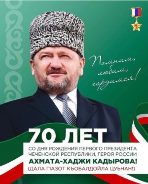 ПЕРВЫЙ ПРЕЗИДЕНТ ЧР, ГЕРОЙ РОССИИ АХМАТ-ХАДЖИ КАДЫРОВ - человек, который в сложившейся для нашего народа критической ситуации, проявил подлинный гуманизм, жизненную стойкость, человеческую мудрость и политический реализм.