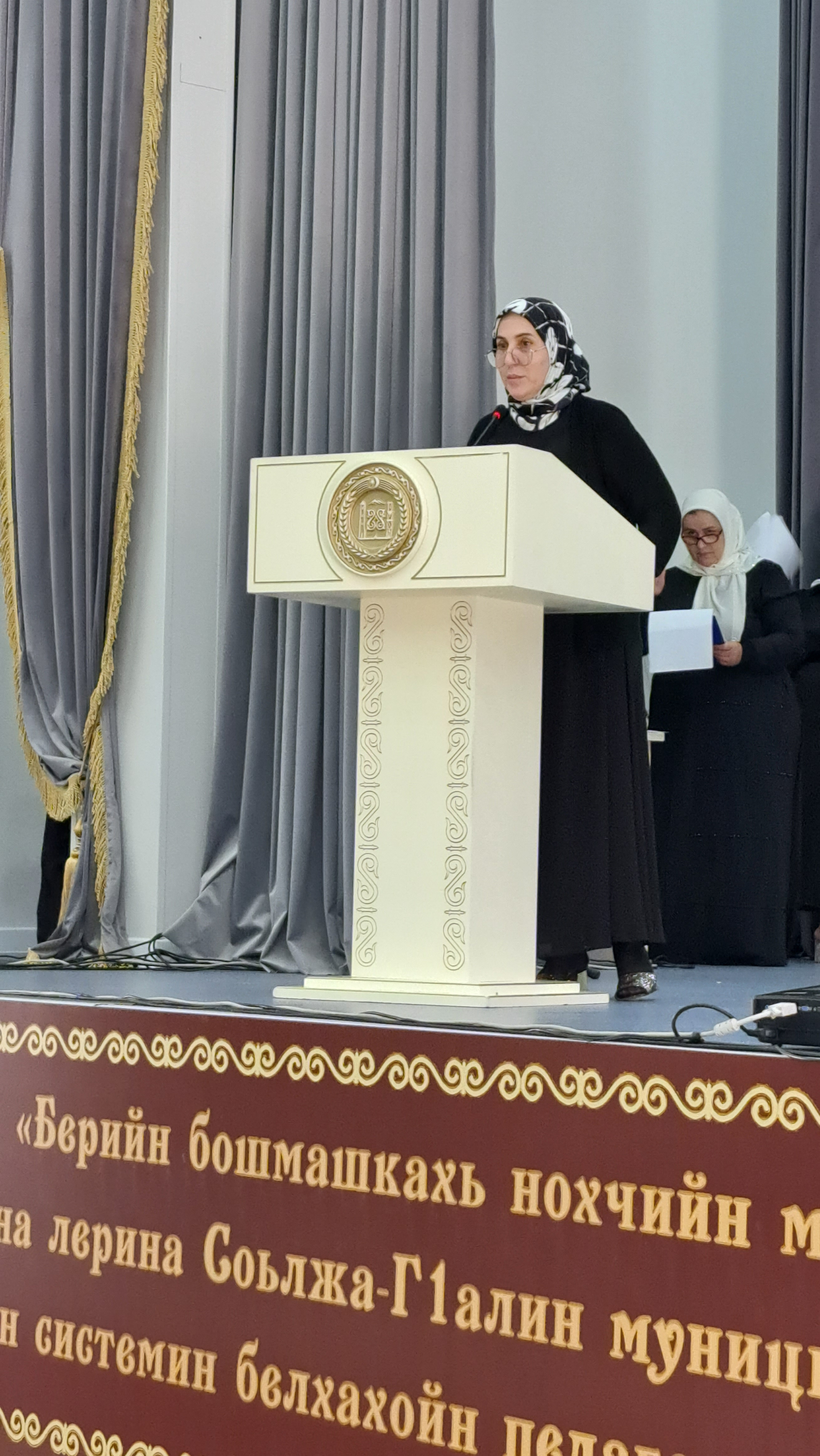 24.08.2023Салам-маршалла ду шуьга лераме доттаг1ий!Вайна массарна хууш ма-хиллара, карара 2023-г1а шо, – Нохчийн меттан шо ду аьлла, шен Указца д1акхайкхина ду вайн Мехк-дас, Россин турпалхочо Кадыров Ахьмад-Хьажин Рамзана. Цуьнан лаамна т1е а тевжина, тахана Соьлжа-Г1алин муниципальни к1оштахь д1айаьхьира «Берийн бошмашкахь нохчийн мотт кхиор а, г1арабаккхар а» темина лерина Соьлжа-Г1алин муниципальни кlоштан школал хьалхарчу дешаран системин белхахойн педагогикин хьаьттан баттахьлера конференци.Конференцин коьрта 1алашо йара: Соьлжа-Г1алин муниципальни к1оштарчу школел хьалхарчу дешаран хьукматашкахь Нохчийн меттан шо д1адахьарехьахула бинчу белхийн жам1аш а деш, т1ейог1учу ханна а оцу хьокъехь дан леринчу г1уллакхийн лехамаш билгалбахар.Цхьанакхетарехь дакъа лоцуш бара леккхара хьеший:Россин Федерацин дешаран «Сийлахь белхало», Россин Федерацин журналистийн а, йаздархойн Союзан а декъашхо, телевизионни «Хаарийн б1ов» программа д1ахьош волу Даудов Хаважин Гилани;Дуьххьаралерчу Президентан, Россин турпалхочун Кадыров Ахьмад-Хьажин ц1арах йолчу «Путь» (Некъ) ц1е йолчу телерадиокомпанин белхало Арипханов Ильясан Адам.Нохчийн Республикан Правительствон школел хьалхарчу дешаран Комитетан «Дешаран а, кхетош-кхиоран а отделан» консультант Юсупов Зеламхан Медни, иштта кхин берш а.Конференци массита декъах х1оттайелла йара, х1ора а дакъа шен чохь доккха масалла долуш дара. Берийн бошмийн тоьлла белхалой билгалбехира Сийлахь кехаташца.Конференци йерзош резолюци т1еийцира: «Дала мукъ лахь, кхин д1а а, ницкъ кхочучу барамехь, берийн бошмашкахь ненан мотт кхиорехьа, г1арабаккхарехь болу болх кхин а жигара боккхуш д1ахьур бу».