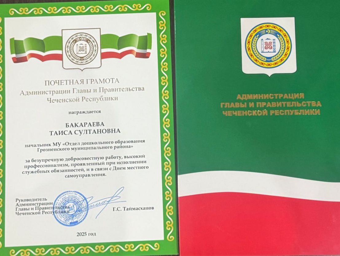 Коллектив Муниципального учреждения «Отдела дошкольного образования Грозненского муниципального района Чеченской Республики» и подведомственные учреждения ДО от всей души поздравляем Вас с вручением Почетной грамоты Администрации Главы и Правительства Чеченской Республики!